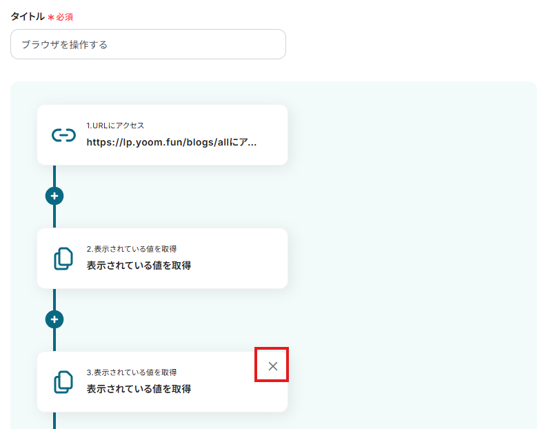 もともとあった「表示されている値を取得」(一番下のブロック)は不要なので、「×」をクリックして削除します。