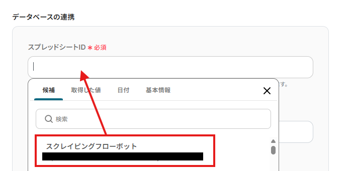 「スプレッドシートID」の入力欄をクリックすると、下記のようにスプレッドシートが選択できますので、先ほど用意したものを選択してください。