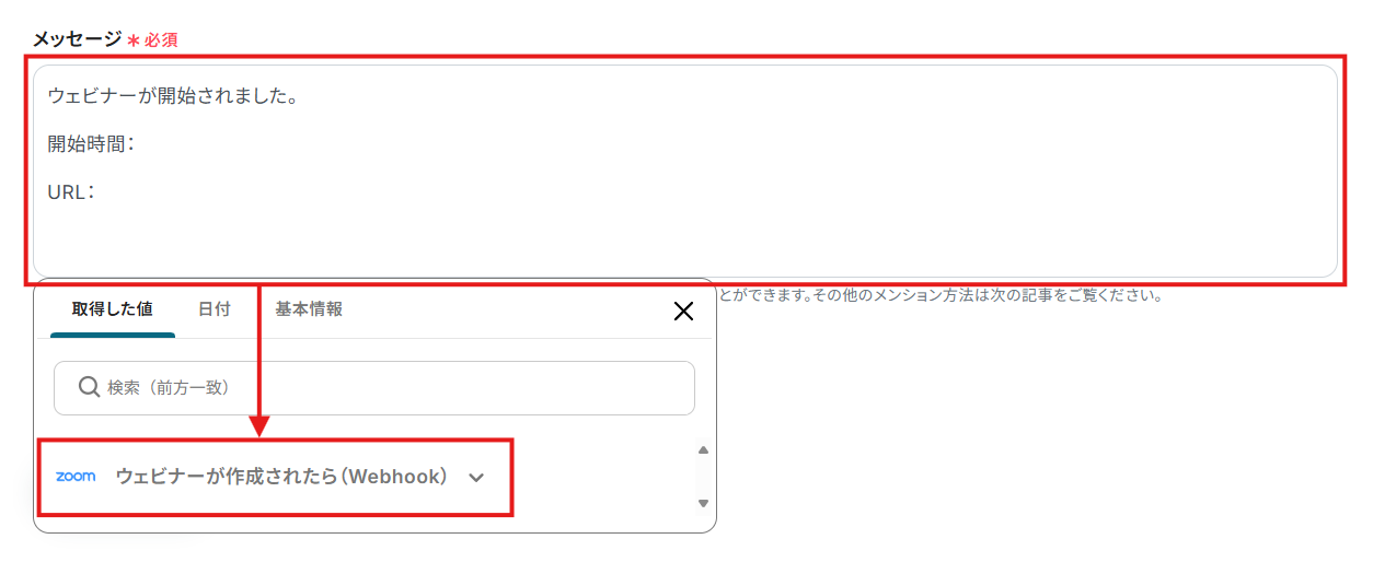 - ウェビナー情報を含む任意の投稿内容を「メッセージ」に設定しましょう。