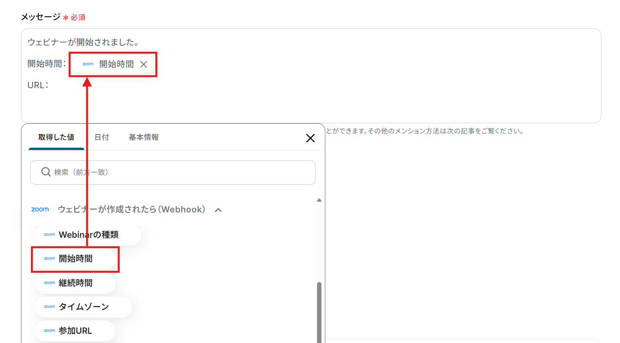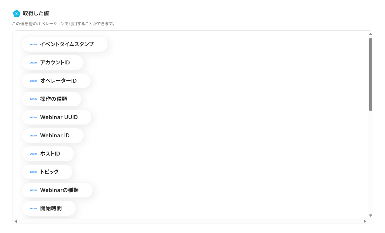 - テストに成功すると、「取得した値」に最新のウェビナーの情報が追加されます。