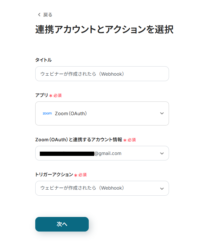 - Zoomの「ウェビナーが作成されたら(Webhook)」をクリック。