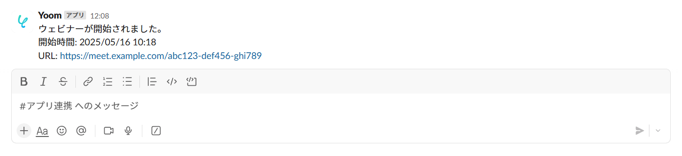 Zoomでウェビナーを作成し、その情報がSlackの指定したチャンネルに投稿されていれば成功です。