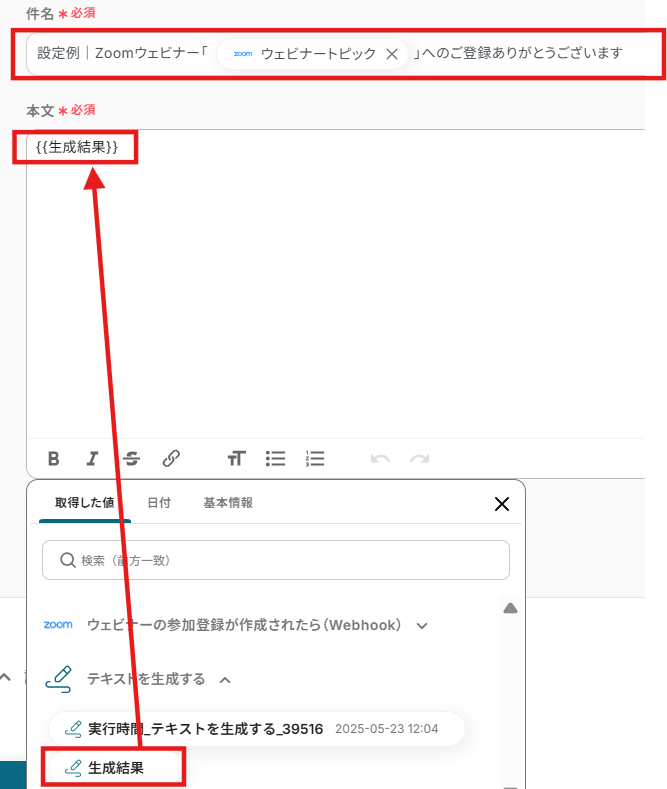 ※「件名」と「本文」は定型文やアウトプットを組み合わせることで、ウェビナーごとの内容に合わせて自動通知できます。