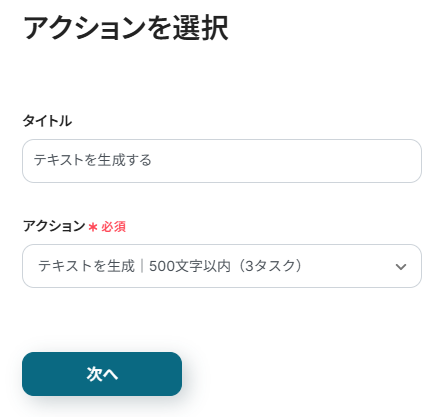 2.想定される文字数に応じて「アクション」を設定し、「次へ」をクリックします。