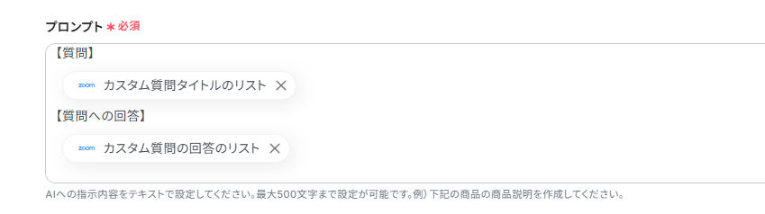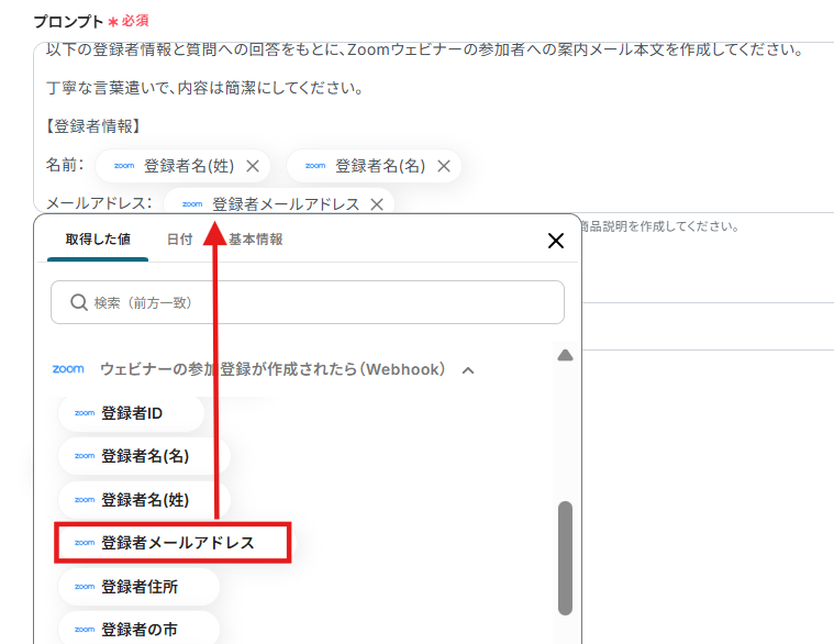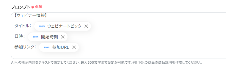 3.プロンプトには案内文を生成するために、トリガー設定で取得したアウトプットから選択します。
