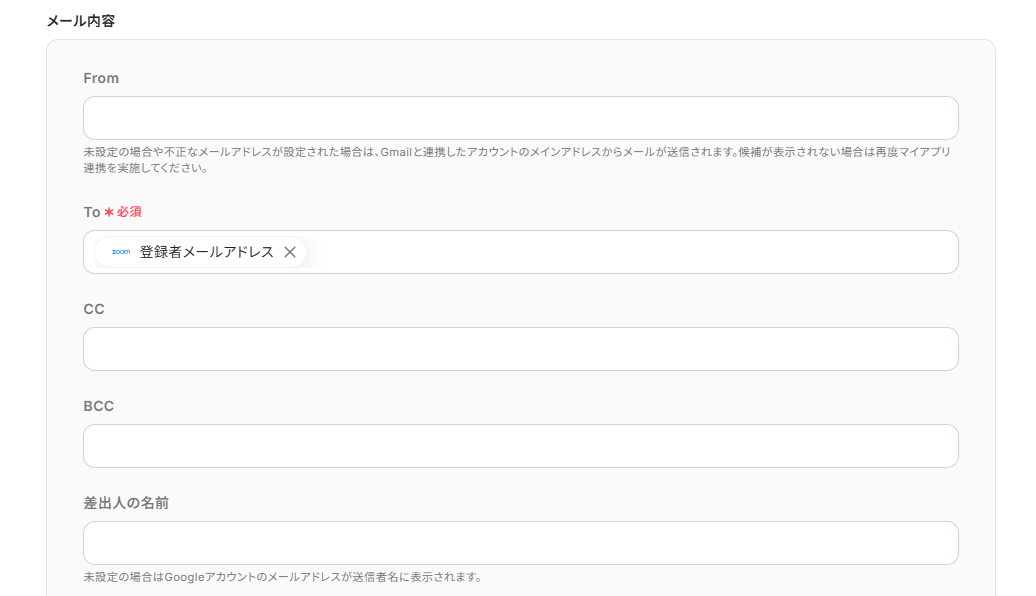 - 「From」→未設定の場合はGmailと連携したアカウントのメインアドレスからメールが送信されます。