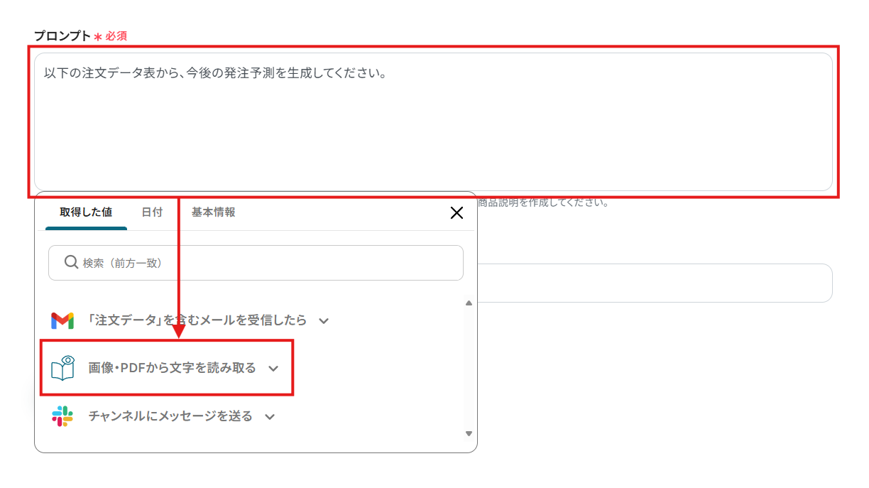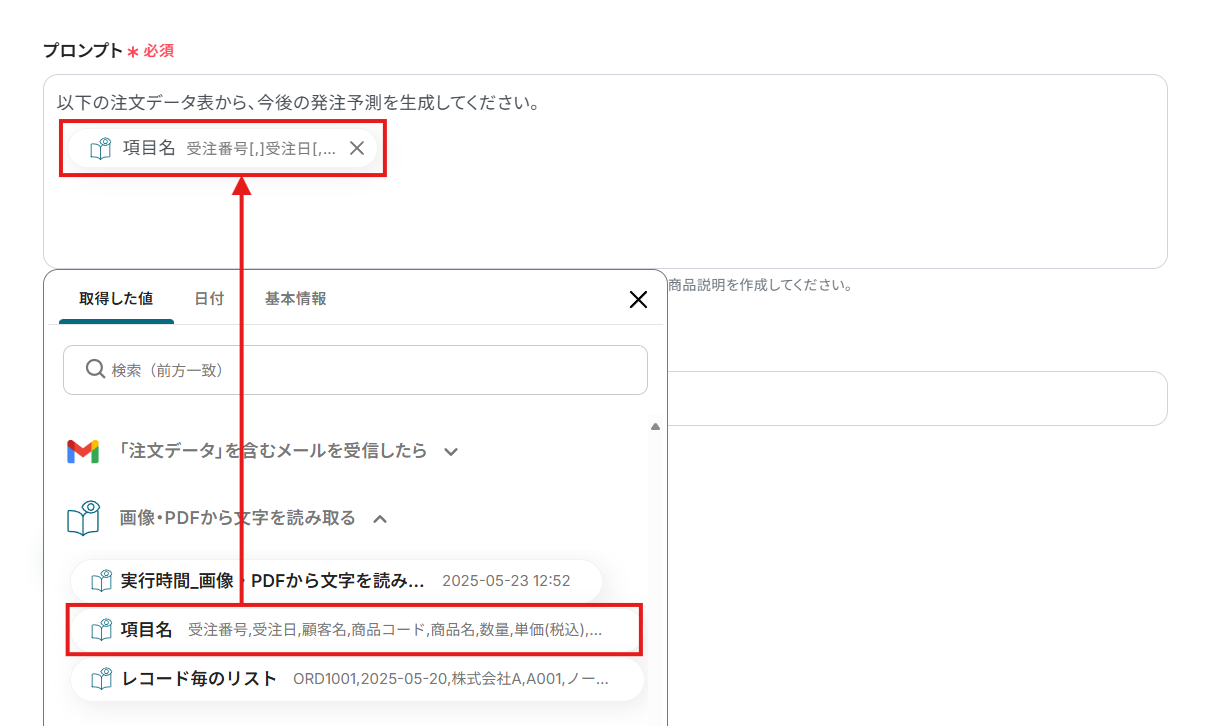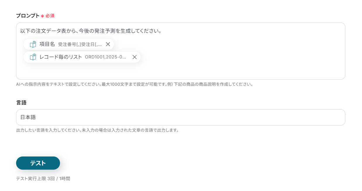 - 「プロンプト」に生成に使用する項目と、生成する発注予測の条件を設定しましょう。