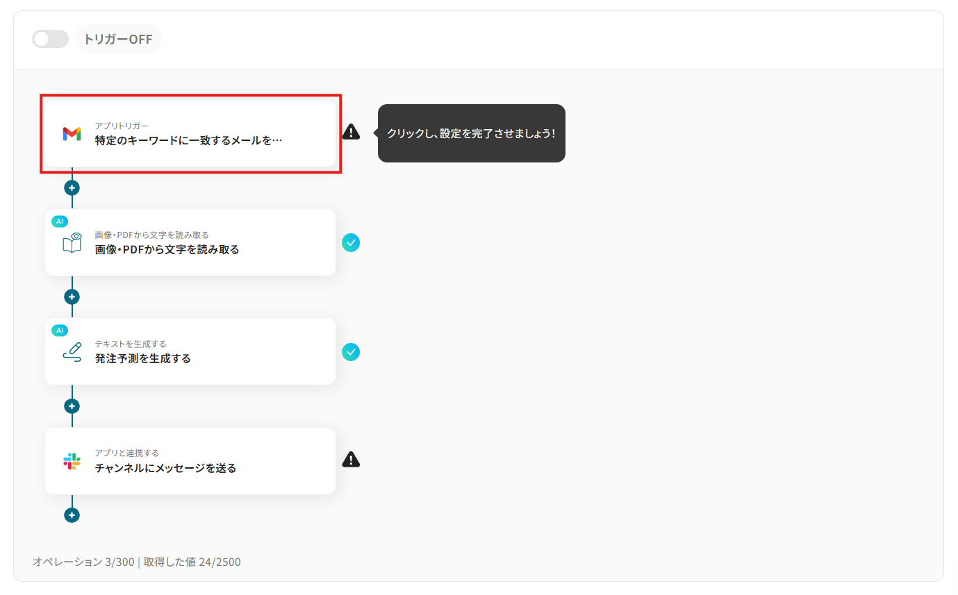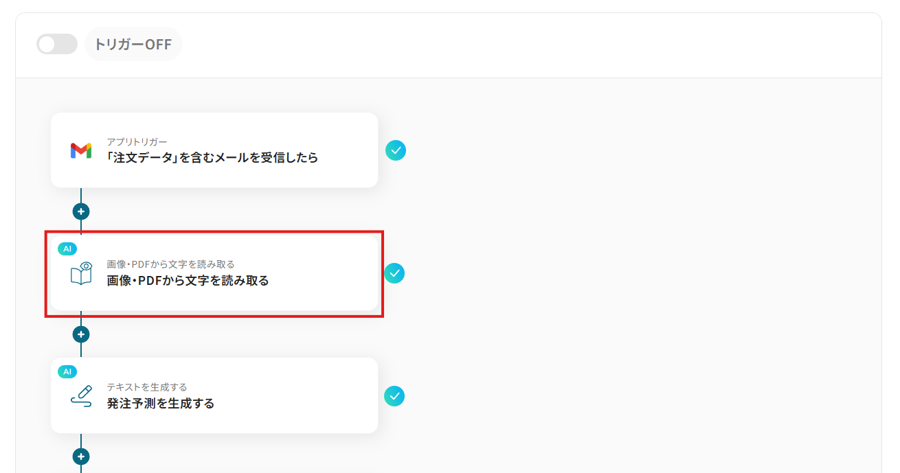 - トリガーとなるメールと各アクション(OCR・発注予測の生成・通知)の設定
