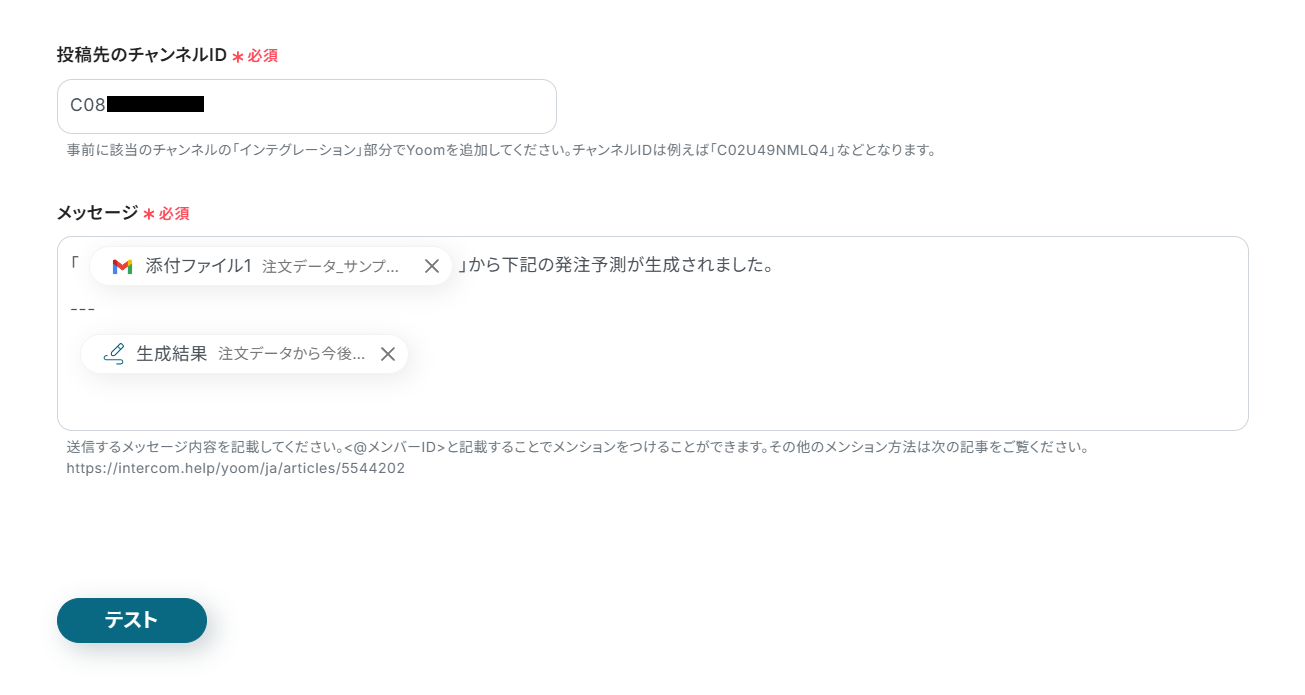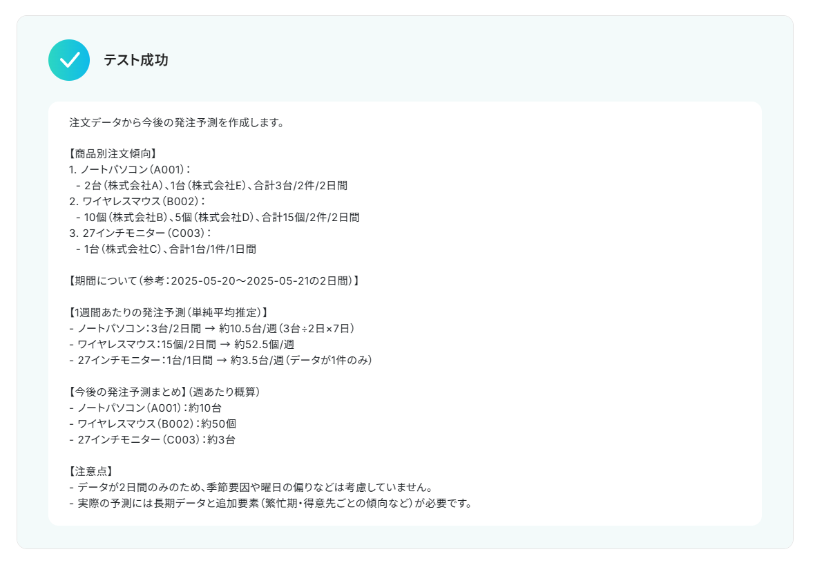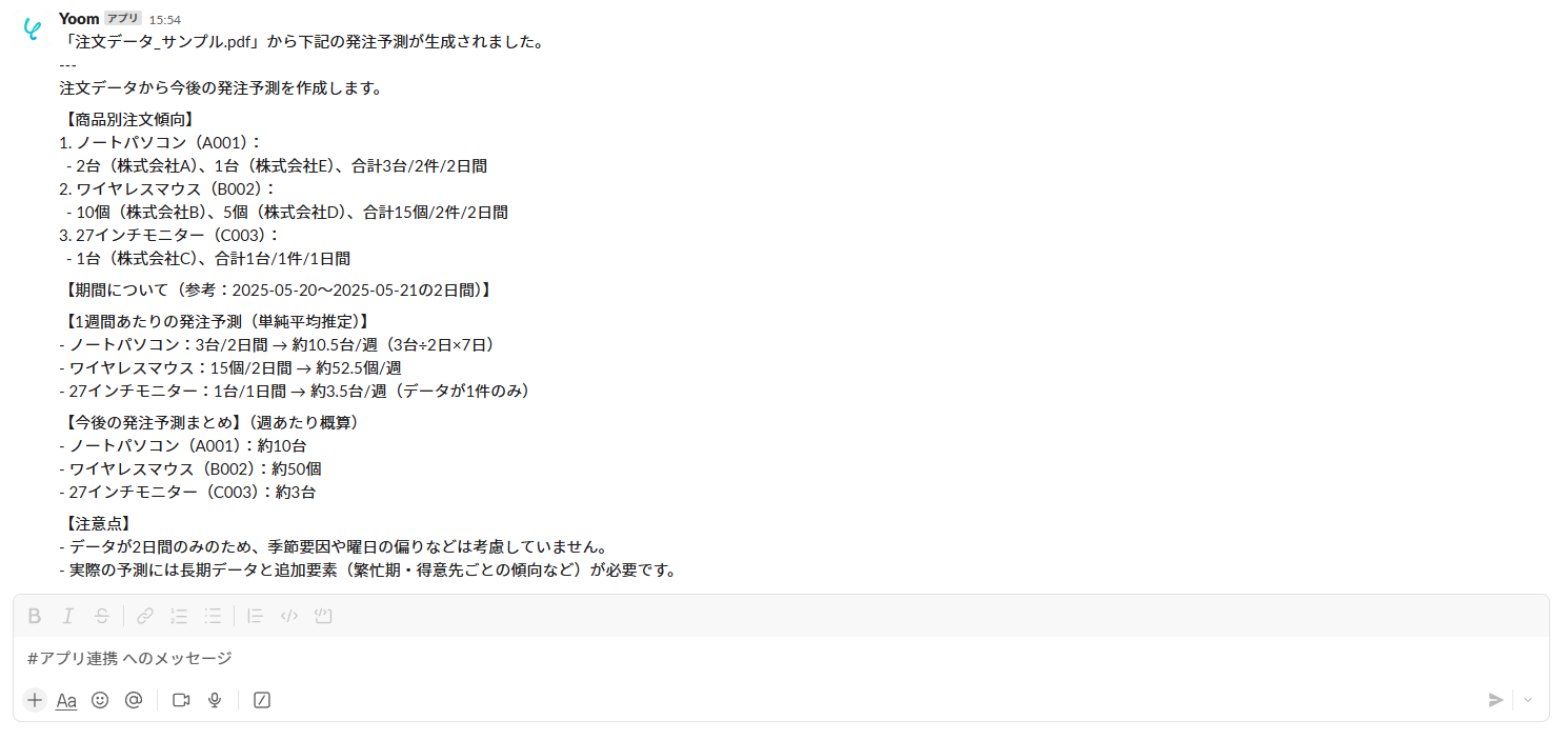 連携しているGmail宛てに指定したキーワードを含むメールを送信し、そのメールに添付されたPDFから生成された発注予測がSlackに投稿されていれば成功です。