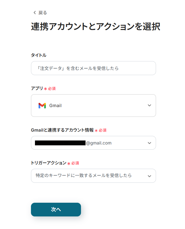 - 連携アカウントとアクションを確認し、「次へ」をクリック。