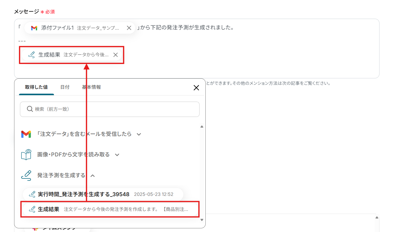 ステップ5のプロンプトと同様に、入力欄クリック時に表示される各アクションのメニューから、取得した値を追加できます。