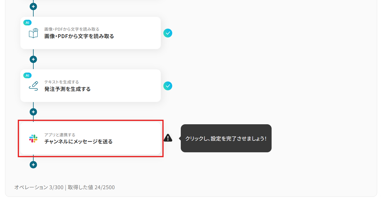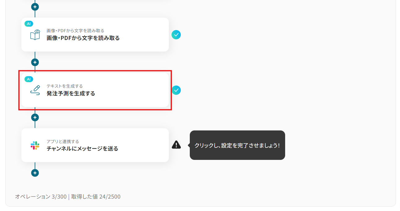 このワークフローでは、Google Driveに月間の注文データがアップロードされたら、OCRで読み取りAIで発注予測を生成して、Slackに通知することが可能です。これにより、手動でのデータ処理や情報共有の手間を削減し、業務効率を向上させます。