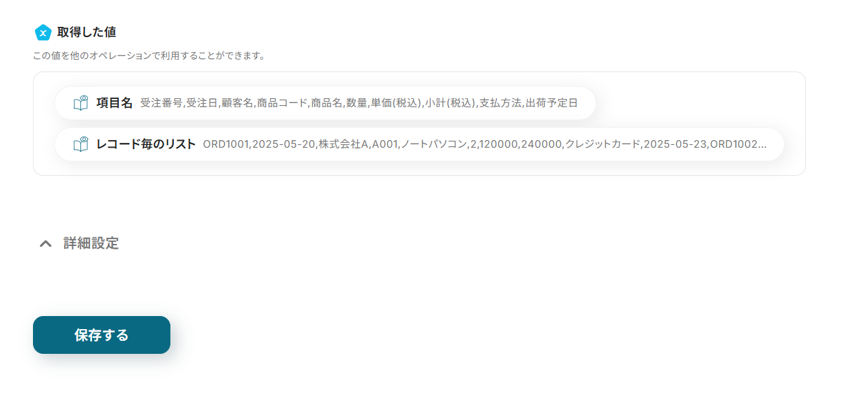 - テストに成功すると、「抽出したい項目」に設定した項目の値がファイルから抽出され、「取得した値」に追加されます。