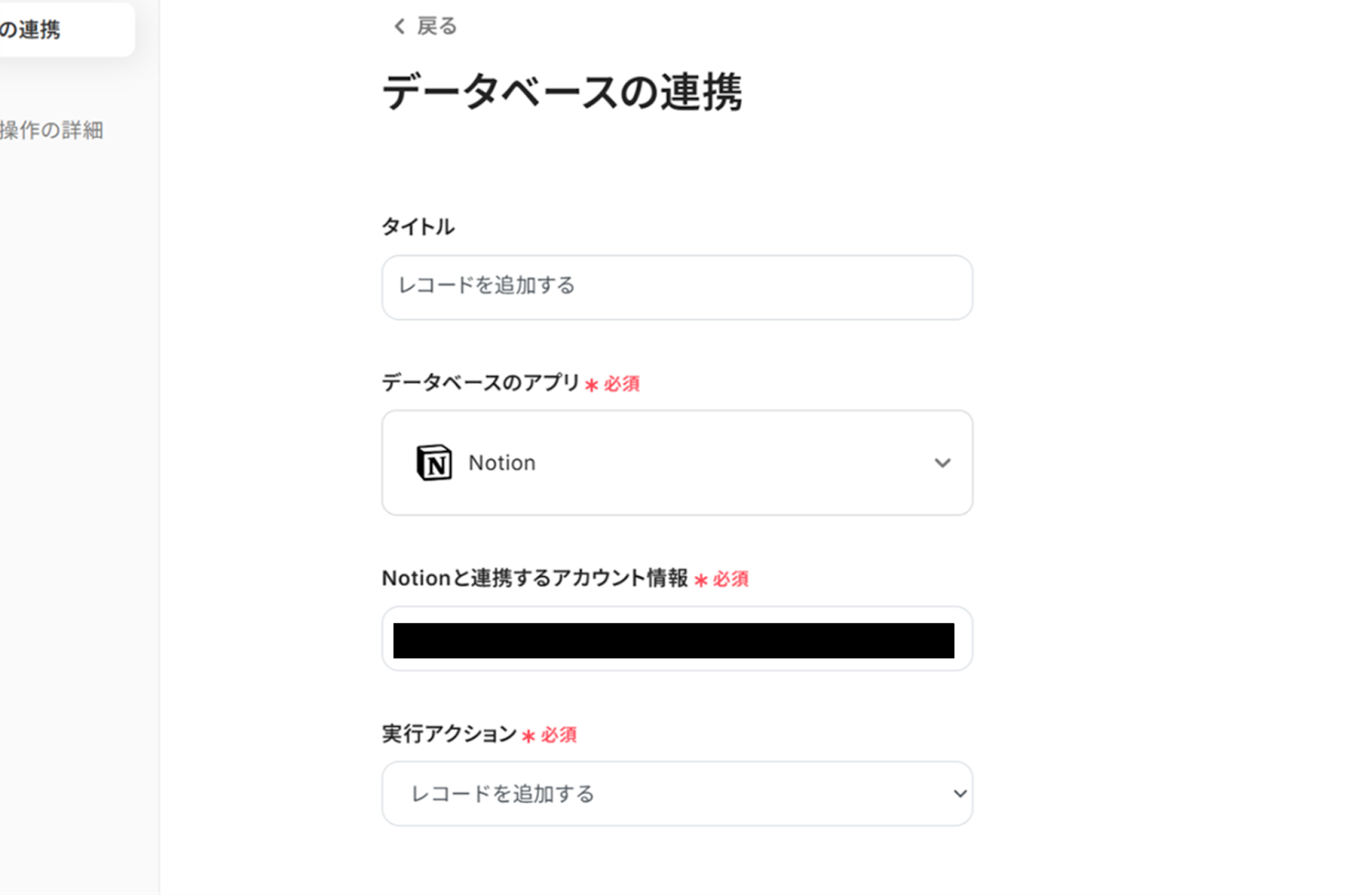 (2)Notionの「データベースの連携」画面から、Notionと連携するアカウント情報に誤りがないかを確認し、実行アクションは「レコードを追加する」のままにします。