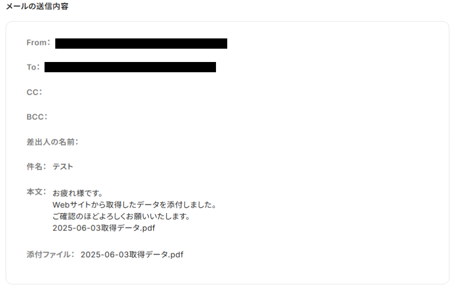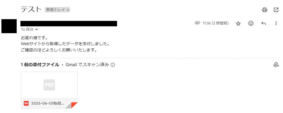 内容に誤りがなければ「テスト」を実行し、成功するとGmailにメールが届いているはずなので確認してみましょう。下記のように、設定したメールが届いていればOKです!