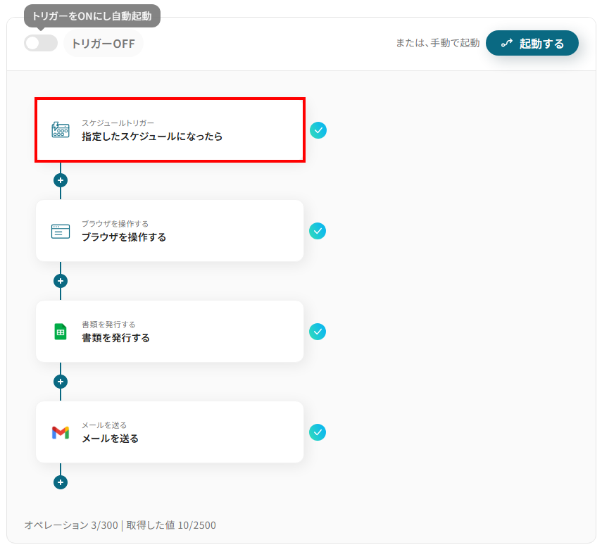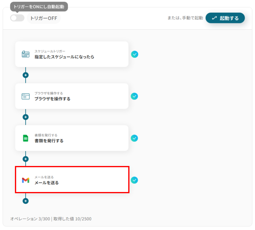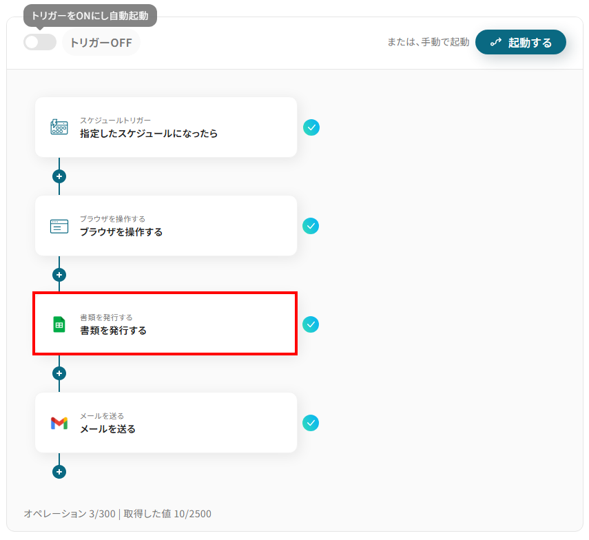 このワークフローは、定期的に特定のWebサイトからRPAを活用して情報を取得し、書類を自動で発行、さらにGmailで通知を行うことで、業務の効率化と手動作業の削減を実現します。