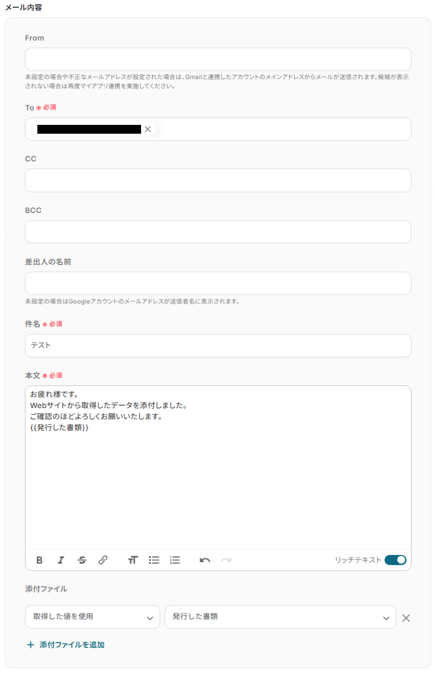 2.ここでは、Gmailで送信するメール内容を設定します。