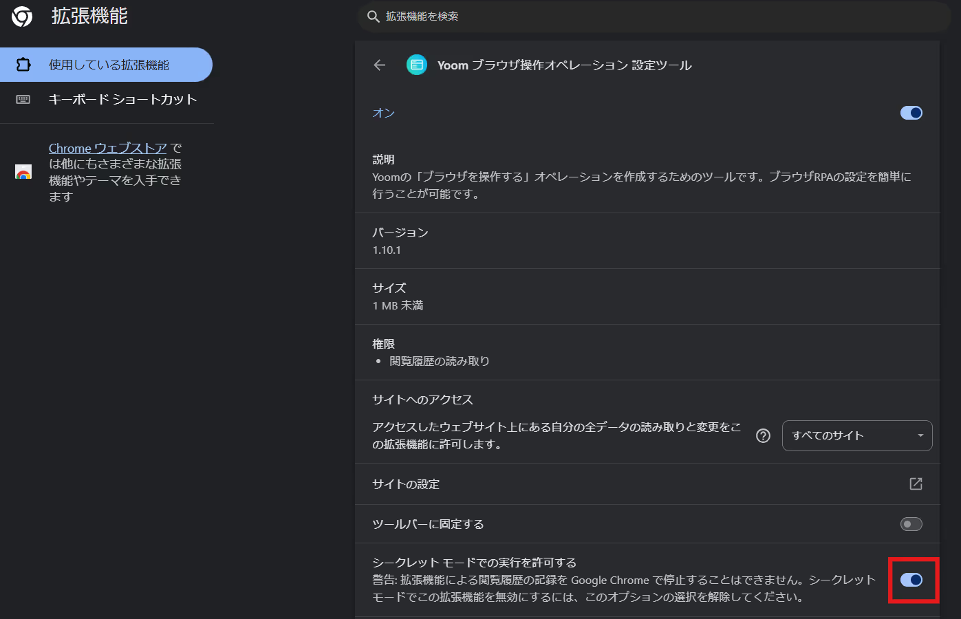 「シークレットモードでの実行を許可する」をクリックしましょう。