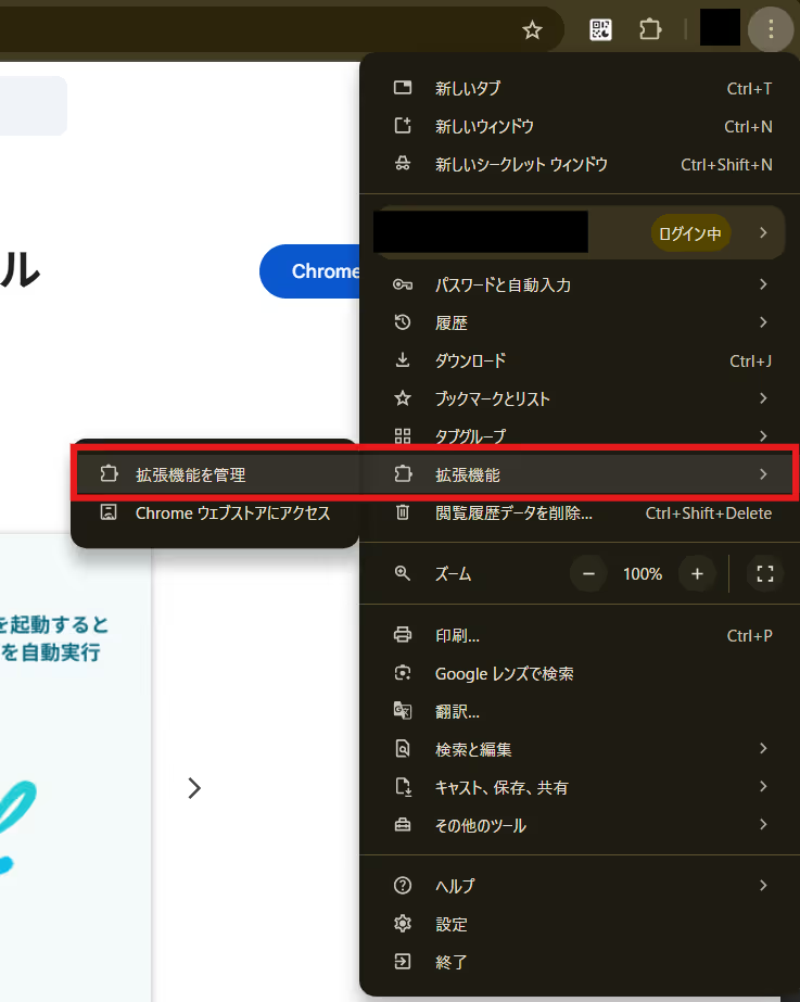 その後、右上の設定から「拡張機能を管理」をクリックし、シークレットモードの設定を行います。