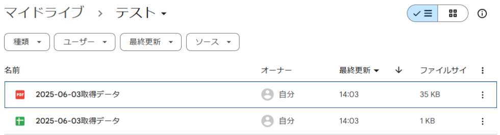 また、指定したGoogle Driveのフォルダに、設定したファイル名でGoogle スプレッドシートファイルとPDFファイルが格納されていることも確認してみましょう。
