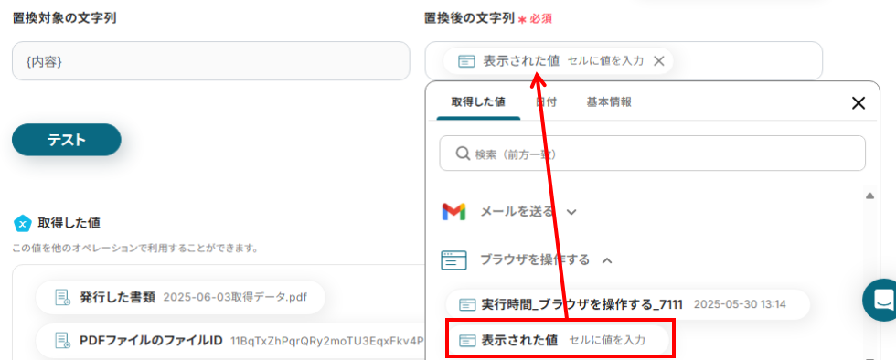 下図のように入力欄をクリックするとアウトプットが表示されるので、「置換後の文字列」に適切な値を設定してください。