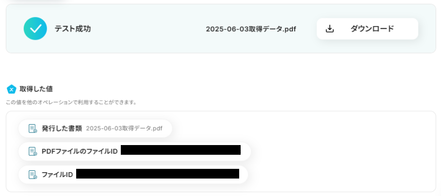 入力が完了したら、「テスト」を実行してください。テストが成功すると、書類のダウンロードボタンとアウトプットが表示されます。