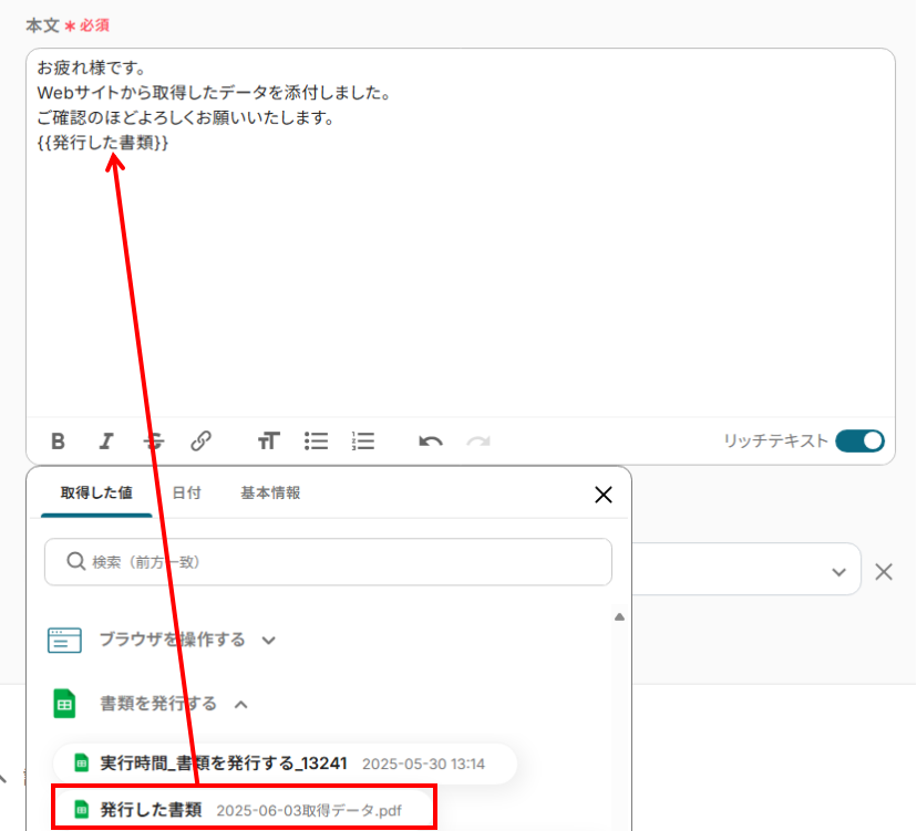 RPAでWebサイトから取得した情報をトリガーとして、自動で書類発行し、その内容をGmailなどのメールツールへ通知することができます。
