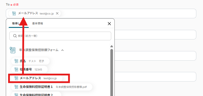 Toには以下のように「取得した値」より、Googleフォームの回答から「メールアドレス」を選択します。
