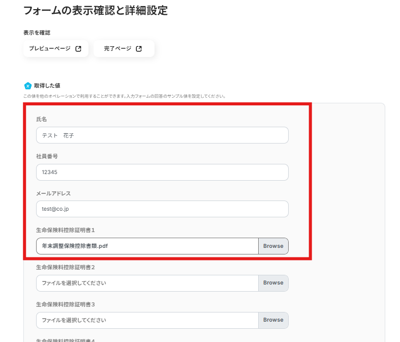 フォームのテスト送信のように、入力した値を今後の設定で使用します。
