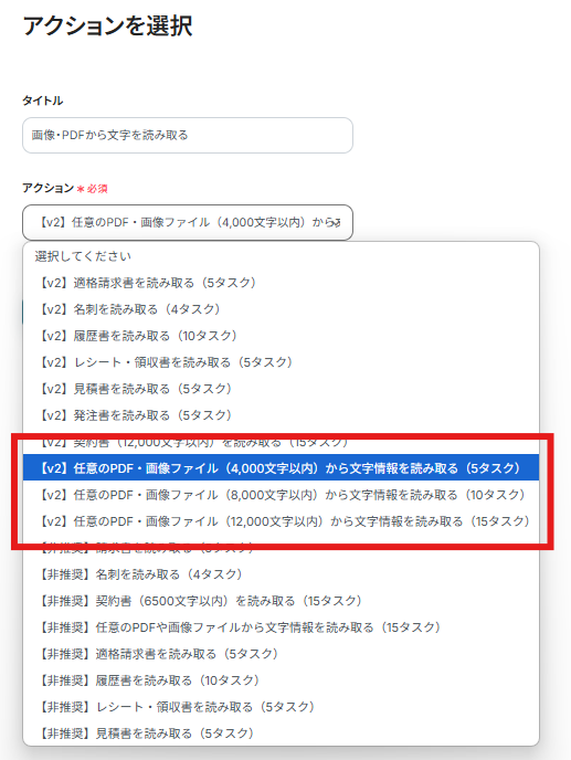 読み取る文字数を任意で選択できるので、必要な文字数や()内の消費するタスクから適切な内容を選択しましょう。