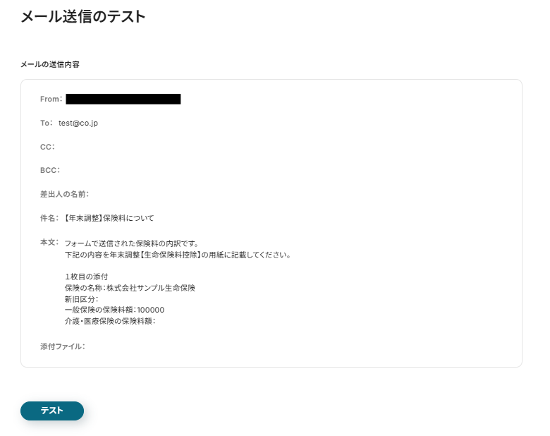メールのテスト送信の画面が表示されるので、内容を確認し「テスト」をクリックしましょう。
