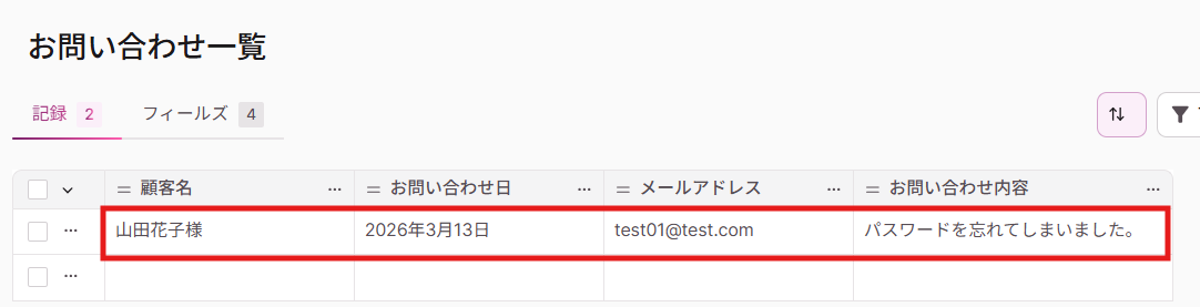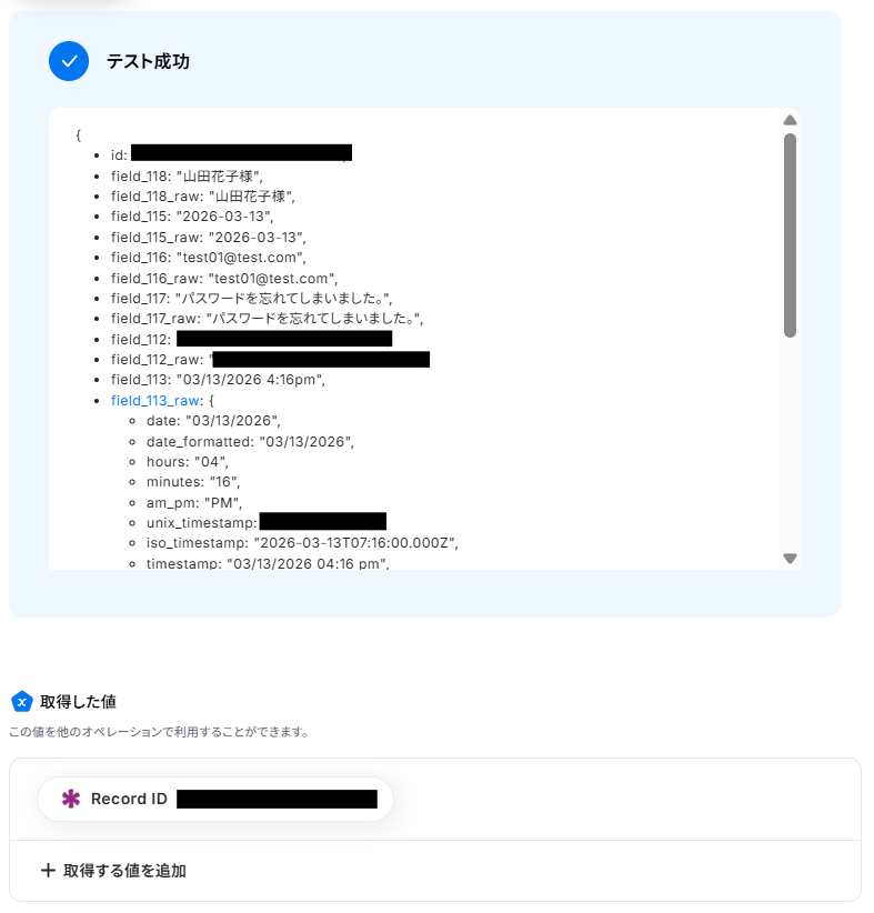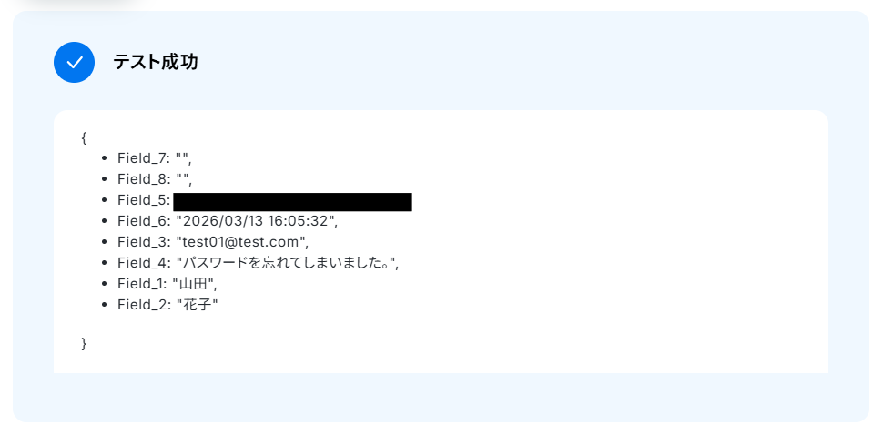 テストが成功すると、先ほどZoho Formsのフォームに送信したテスト用の回答が表示されます。