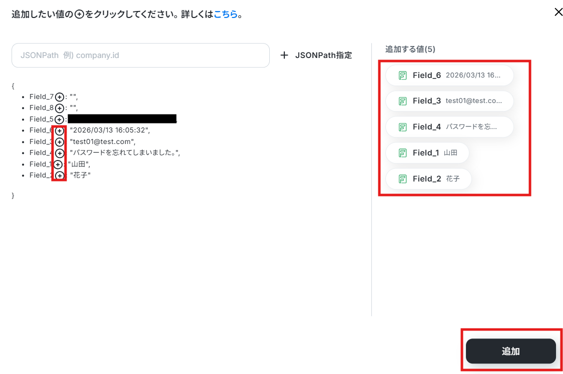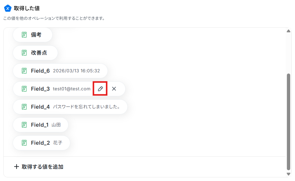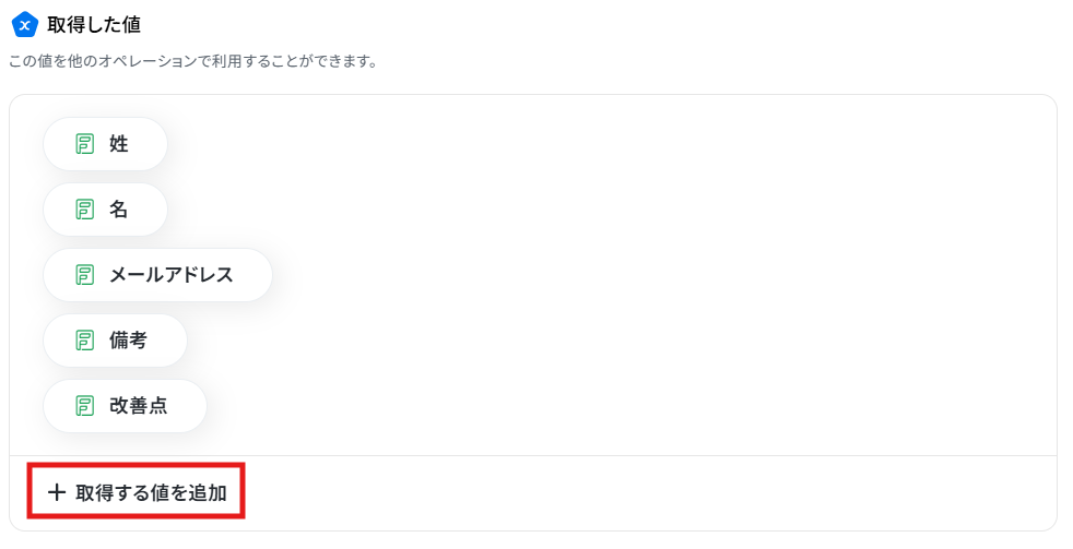 「+」と記載されている箇所の値を、取得した値として追加できます。