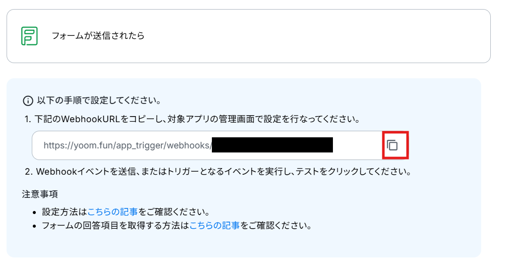 Zoho Formsでフォームの準備ができたら、Yoomの操作画面に戻り、Webhookを設定します。