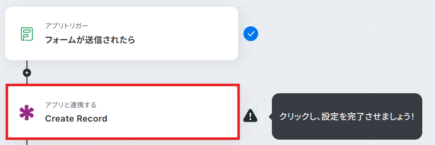 - 最後に、オペレーションでKnackを選択し、「Create Record」アクションを設定することで、フォームの回答内容をKnackのレコードとして登録します。