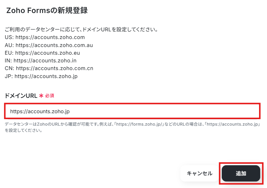 以下の画面が表示されるので、ドメインURLを設定し「追加」をクリックしてください。
