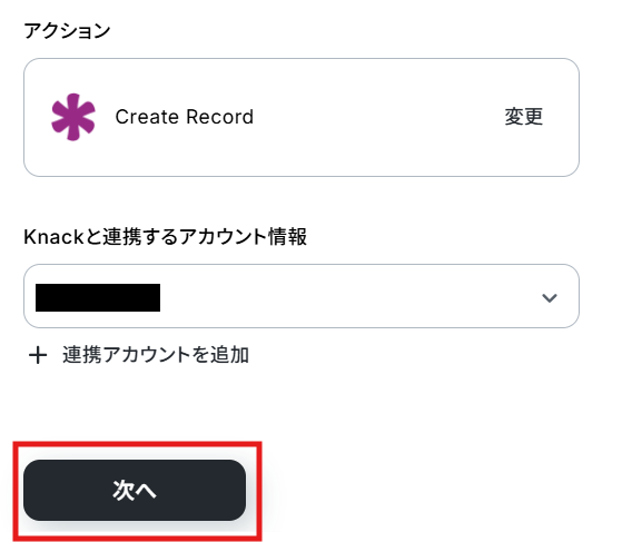 クリックすると以下の画面に移ります。Zoho Formsと同様に、ステップ1でマイアプリ連携したKnackのアカウント情報が自動で表示されます。アクションは、「Create Record」のままで次に進みましょう!