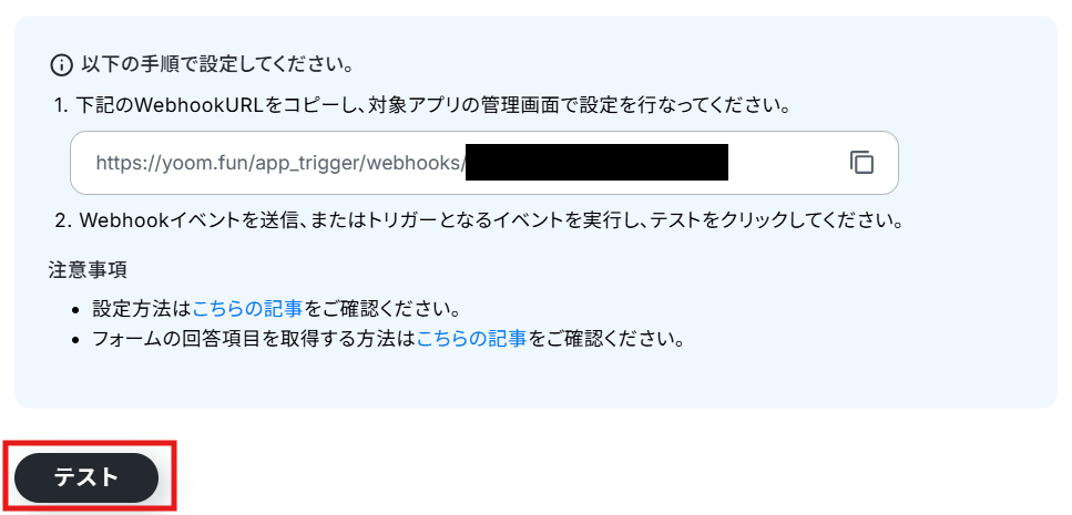 回答送信後、Yoomの操作画面に戻り「テスト」をクリックしてください。