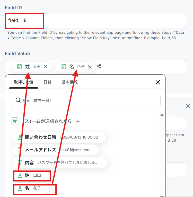 このままだと回答が反映しないので、Zoho Formsのフォームに送信した回答を「取得した値」として追加します。