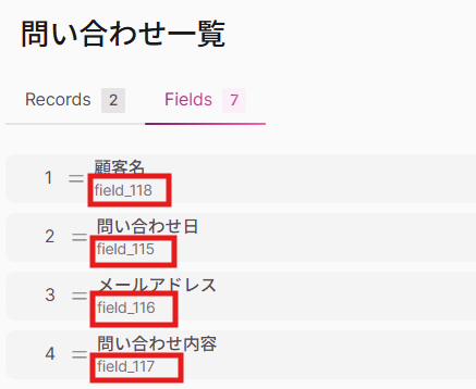 「field_●」と記載されている箇所が、フォームに送信された回答です。