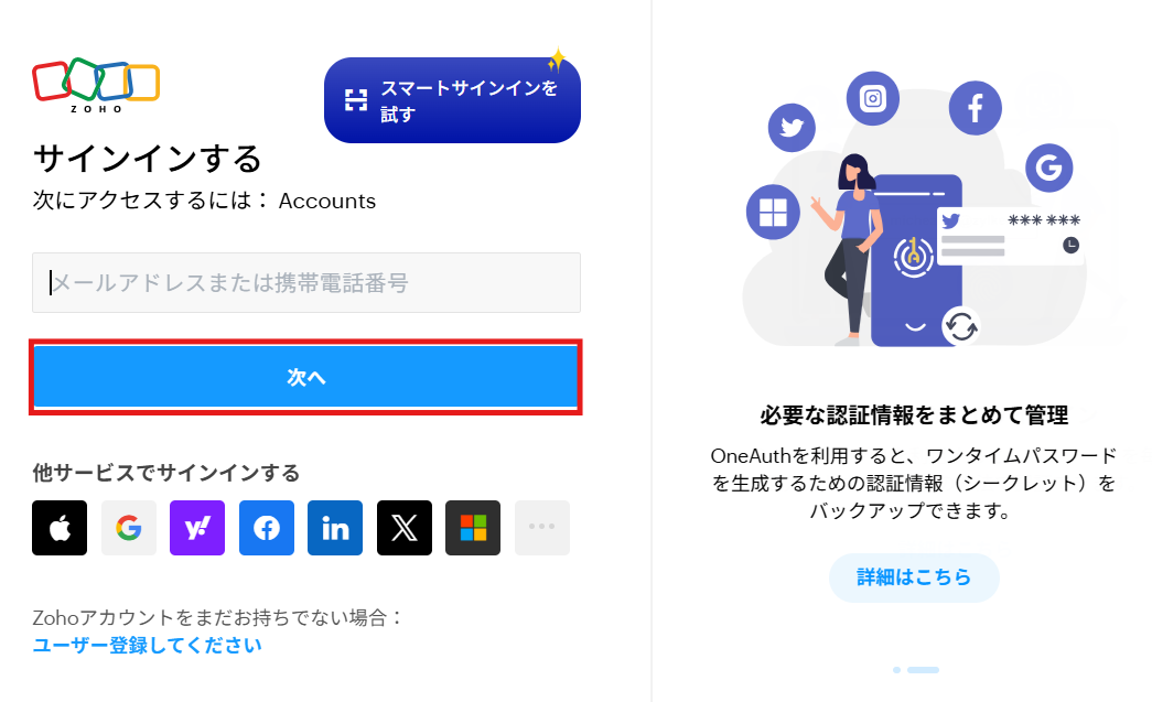 Zoho Formsのサインイン画面に移行するので、Yoomと連携したいZohoアカウントでログインします。