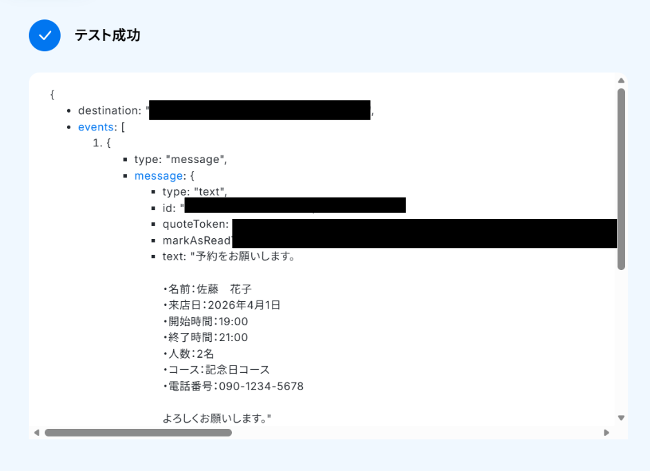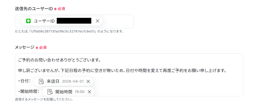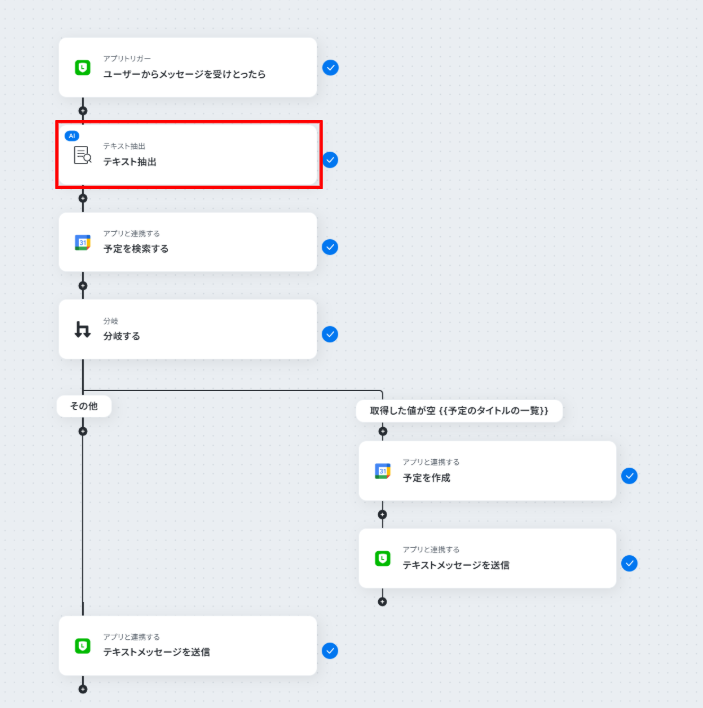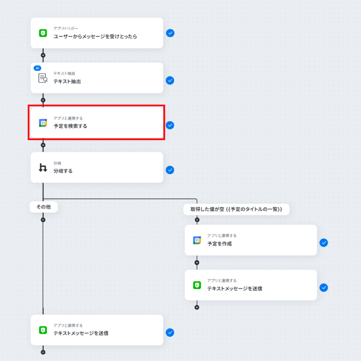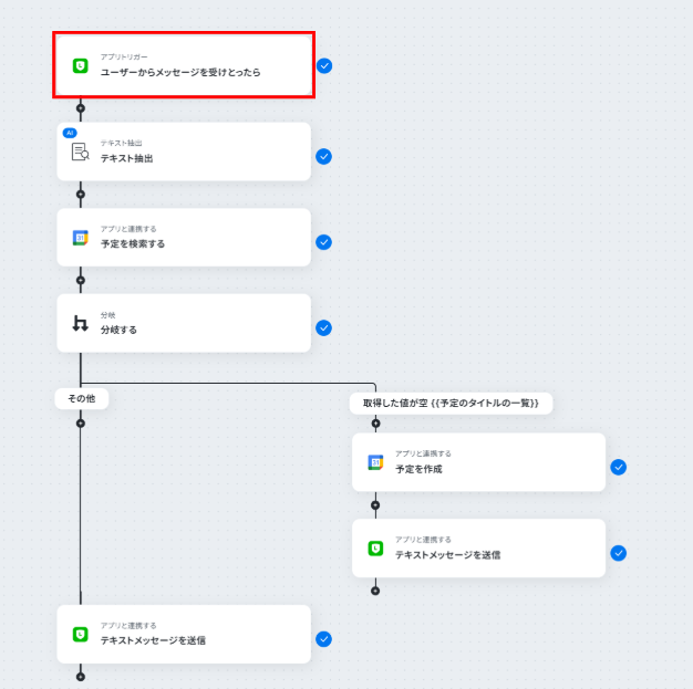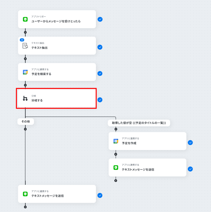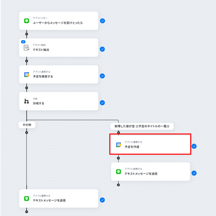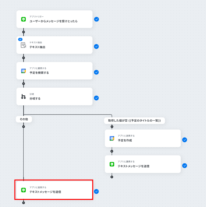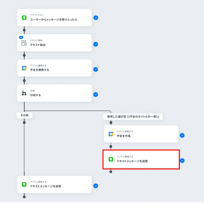 - 最後に、LINE公式アカウントの「テキストメッセージを送信」アクションで、予約完了または予約不可の旨をお客様に自動で返信します。