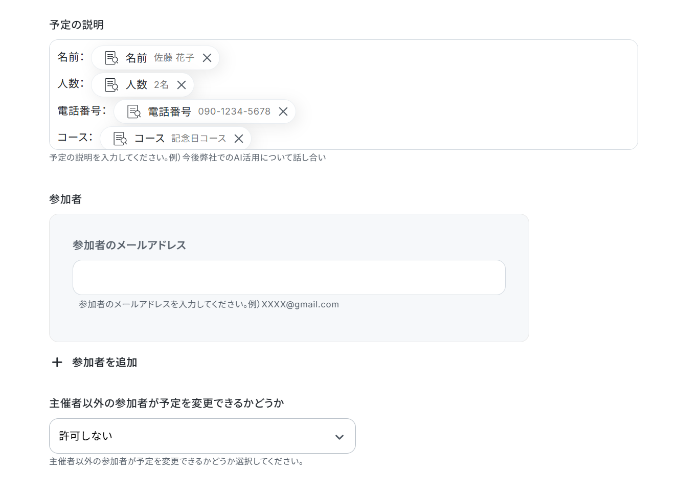 - Googleカレンダーで予定を検索したり、新規で作成したりする際、タイトルや説明欄にAIで抽出した予約情報などを変数として埋め込むことが可能です。