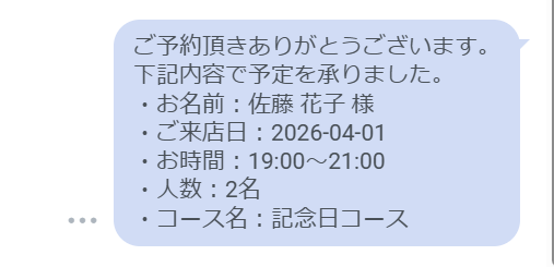 - LINE公式アカウントからの返信メッセージは、予約完了時や満席時など、状況に応じた内容を固定値や変数を用いて自由にカスタマイズできます。