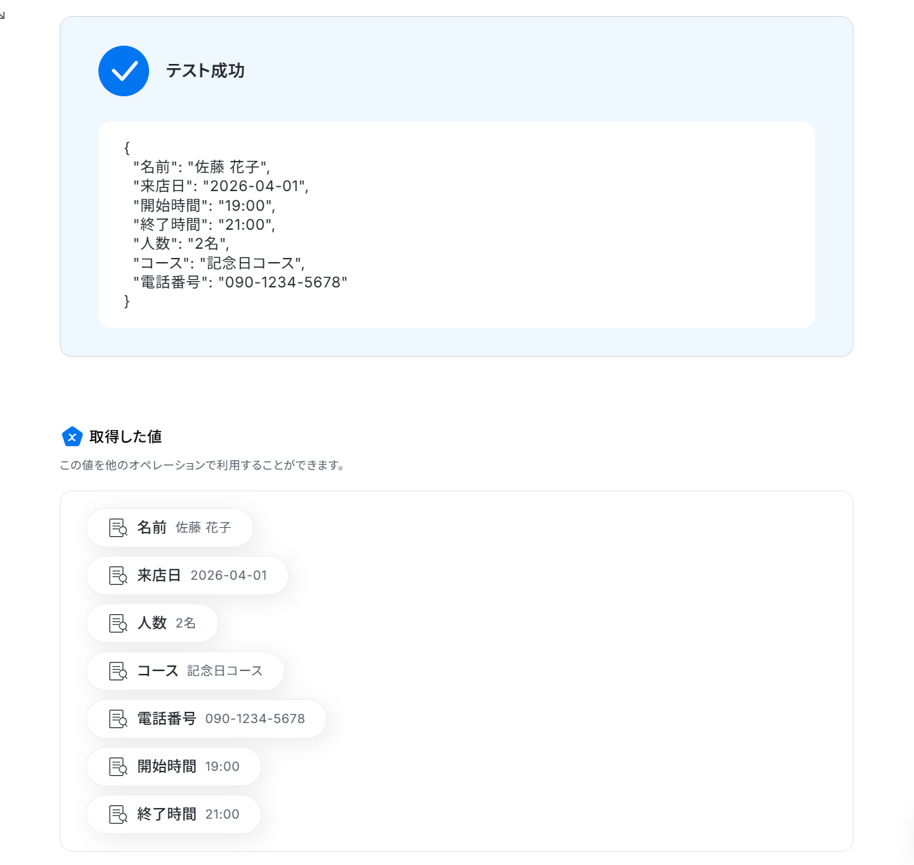 テストに成功すると、「抽出したい項目」に入力した内容が「取得した値」に追加されます。