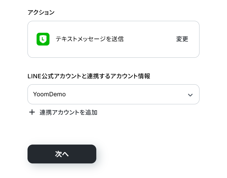 - 最後に、オペレーションでLINE公式アカウントを選択し、「テキストメッセージを送信する」アクションを設定します。