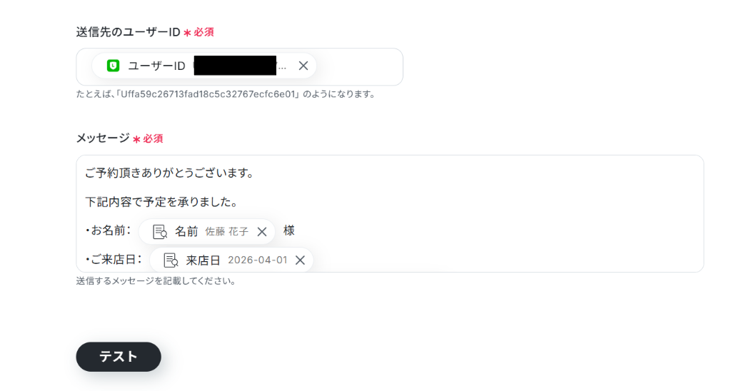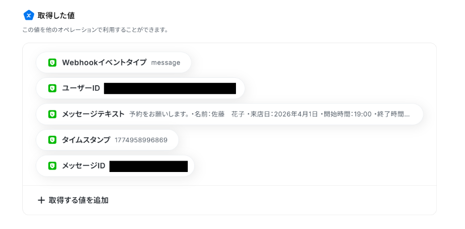 「取得した値」を使って入力することで、都度変更することなくLINE公式アカウントの最新メッセージを反映することができます!