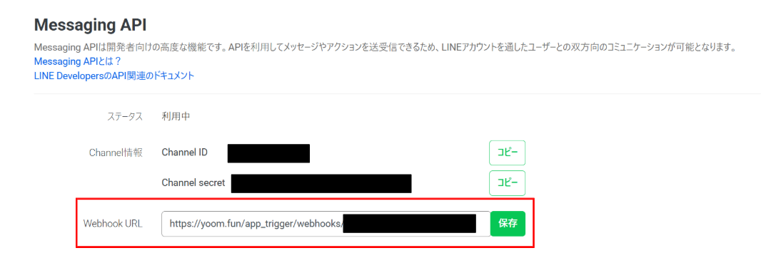 LINE公式アカウントの管理画面からコピーしたWebhookURLを貼り付けて保存します。