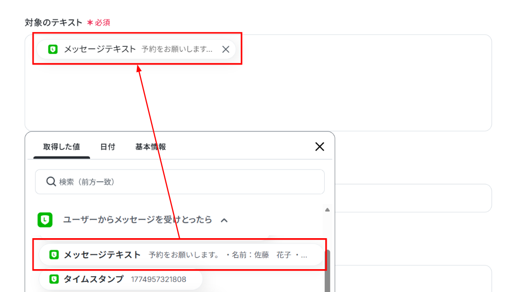 「対象のテキスト」に先ほどLINE公式アカウントで取得した「メッセージテキスト」を入力します。