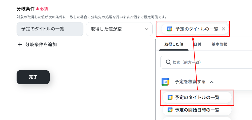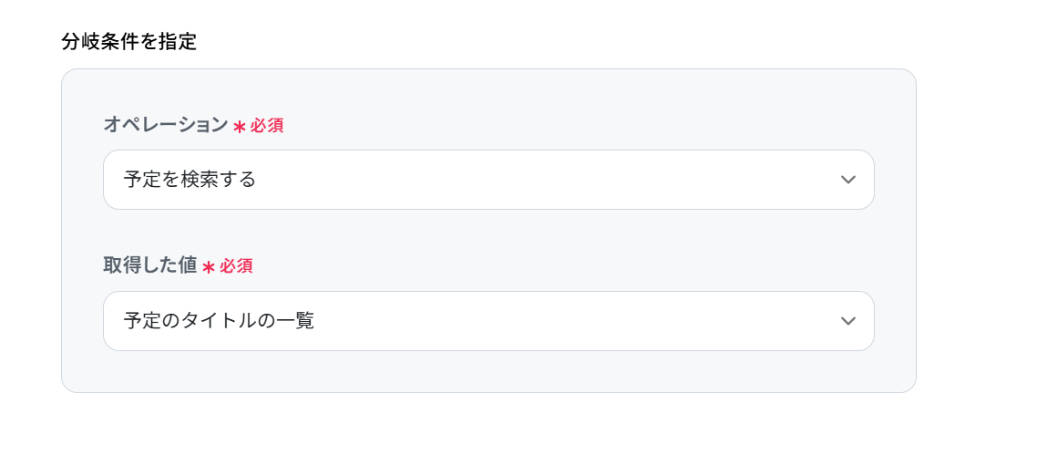 - 分岐機能では、Googleカレンダーの検索結果など前段で取得した情報をもとに、後続の処理を分岐させる条件を自由に設定できます。